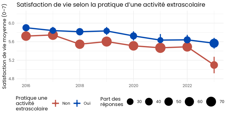 Il est largement reconnu que l’activité physique exerce des effets bénéfiques multiples, tant sur la motricité que sur la santé physique et métabolique, mais également sur la santé mentale, et ce aussi bien chez les jeunes que chez les adultes6. Au-delà de la seule activité physique, la participation à une activité extrascolaire – qu’il s’agisse de sport, de danse, de musique ou d’arts plastiques – est également associée à un niveau de satisfaction de vie plus élevé chez les enfants et adolescents7. Ainsi, selon nos données, le recul de satisfaction entre 2016 et 2023 est deux fois plus important chez ceux qui n’ont pas d’activités extrascolaires que chez ceux qui en pratiquent (Figure 4).