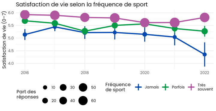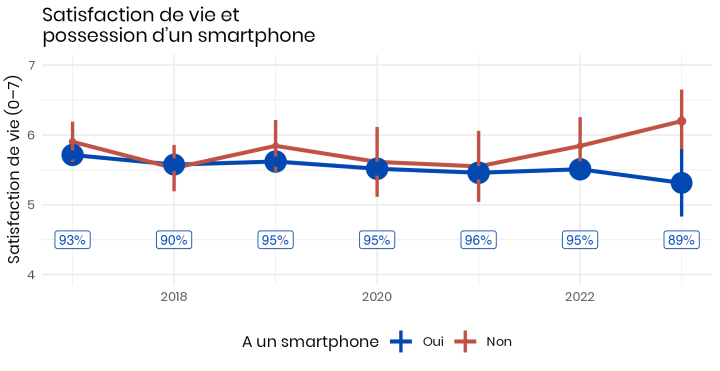 Du fait de cette homogénéité, la possession de cet équipement n’est pas associée à une différence observable de satisfaction jusqu’en 2021. Un écart apparaît toutefois en 2022 et 2023, mais il n’est pas statistiquement significatif (la vague de 2023 est moins nombreuse, ce qui limite la précision des estimations).
