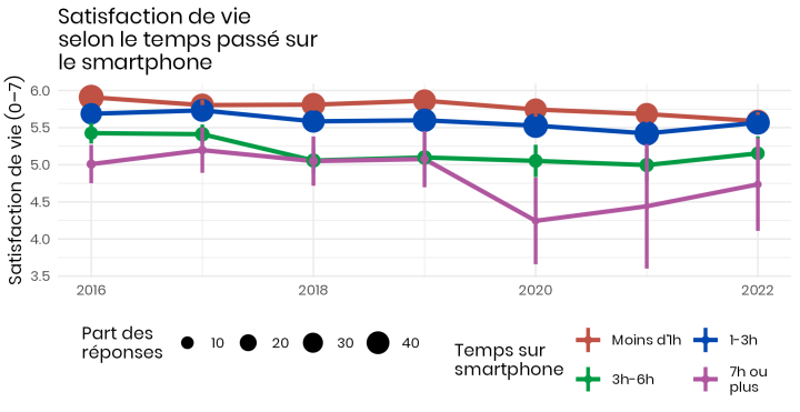 Le temps passé sur le téléphone semble cependant jouer un rôle (Figure 9). En dessous de trois heures d’utilisation par jour, les écarts de satisfaction sont faibles, mais une différence apparaît chez la minorité d’enfants qui en font une utilisation importante (3 à 6 heures par jour) ou très importante (7 heures ou plus).