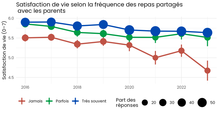 Pour mesurer cet investissement parental, nous disposons d’une mesure indirecte : la fréquence des repas partagés avec les parents. En tant que tels, les repas partagés en famille sont associés à un surcroît de satisfaction de vie encore plus élevé que la participation à des activités extrascolaires (Figure 6 et Figure 7).