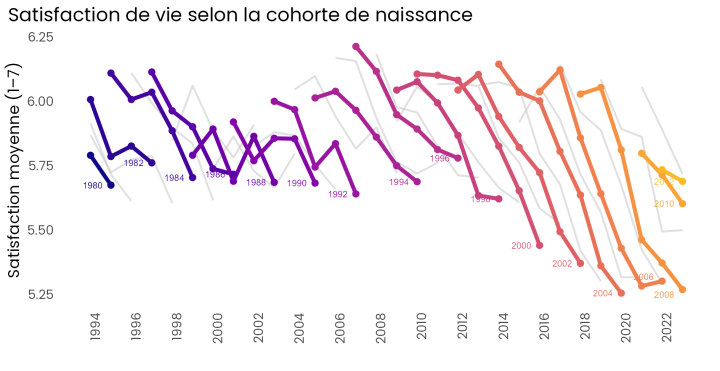 La Figure 2 représente la satisfaction dans la vie selon l’année de naissance des répondants, c’est-à -dire l’évolution de la satisfaction de vie moyenne de chaque cohorte.
