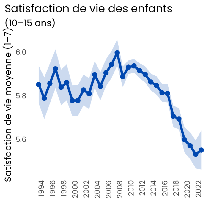 Grâce à l’enquête britannique Understanding Society, nous analysons le bien-être subjectif des jeunes âgés de 10 à 15 ans au cours des 10 dernières années. Les pré-adolescents d’aujourd’hui se disent moins heureux que ceux de 1994 ou même de 2016, avec une perte moyenne de 0, 5 points de satisfaction dans la vie (sur une échelle allant de 1 à 7). Cette chute du bien-être est particulièrement marquée chez les jeunes filles et les jeunes des ménages les plus modestes.