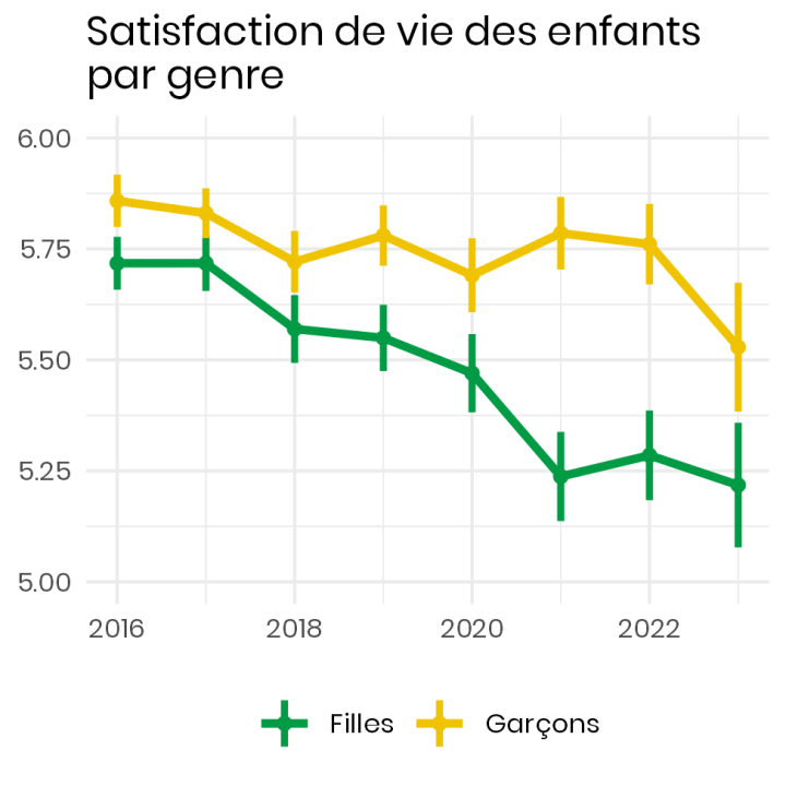 En 2016, la satisfaction de vie des filles s’élevait à 5, 75 sur 7, contre 5, 80 pour les garçons — un niveau comparable entre les deux sexes. Mais au fil des années, la situation s’est dégradée, en particulier pour les adolescentes. En 2023, leur satisfaction de vie n’est plus que de 5, 25, tandis que celle des garçons s’établit à 5, 50 (Figure 3).
