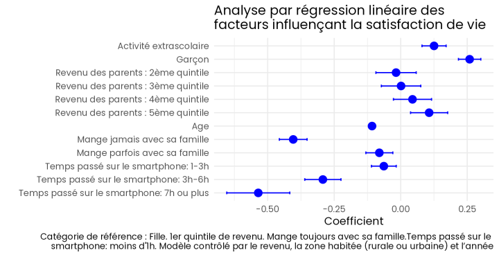 Variable dépendante: la satisfaction dans la vie (notée de 1 à 7). Lecture: être un garçon est lié à un niveau de satisfaction de vie plus élevé, avec un effet moyen de 0,23 point par rapport aux filles.