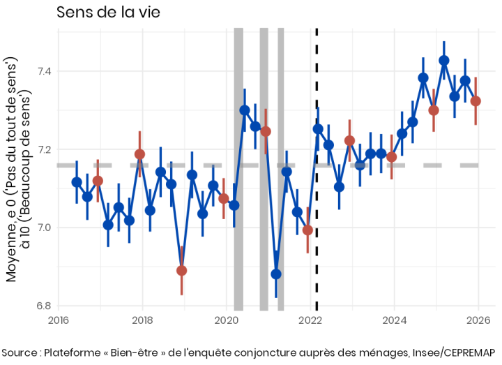 Malgré un léger rebond, les perspectives individuelles restent plus pessimistes que la moyenne depuis 2016 (Figure 6). De même, l’indice synthétique de confiance des ménages de l’Insee, largement fondé sur les anticipations économiques des ménages, demeure déprimé. L’écart entre ces deux indicateurs, qui ont divergé en 2022, reste stable : ce sont encore les aspects économiques qui semblent dicter les évolutions de l’appréciation de l’avenir.