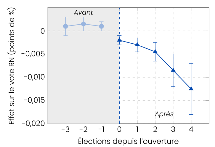 Les résultats révèlent un effet miroir des fermetures. À la première élection post-ouverture, l’effet est modeste : −0,20 point de pourcentage. Il s’amplifie ensuite régulièrement pour atteindre −1,25 point après 20 ans pour les législatives.