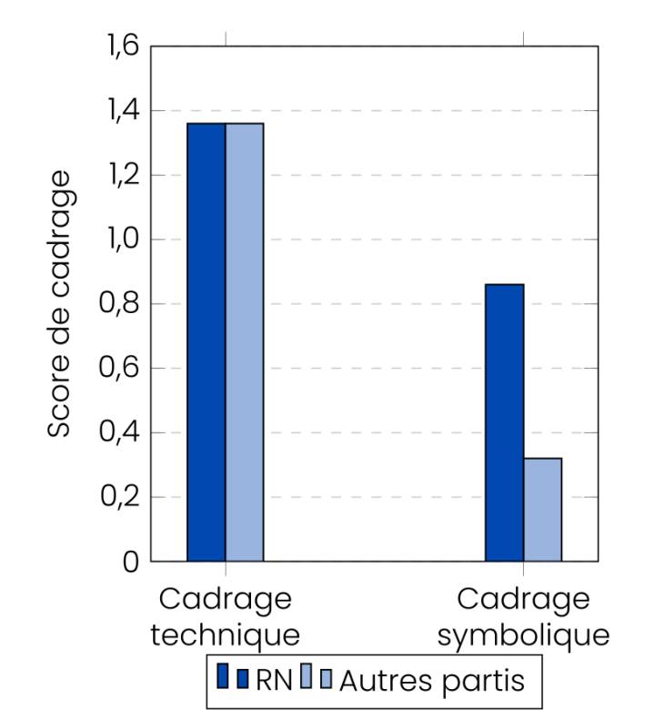 L’analyse de 2,19 millions d’interventions parlementaires (2007–2024) permet d’observer comment le RN a construit un registre discursif distinct. Sans prétendre à une comparaison exhaustive des stratégies de tous les partis, les données montrent que le RN ne parle pas plus souvent des bars-tabacs que les autres partis : seulement 0,59 % de ses interventions mentionnent ces sujets, contre 1,68 % pour le groupe socialiste et 1,25 % pour la droite républicaine22. Mais quand il en parle, il utilise 2,7 fois plus de termes relevant du cadrage symbolique (France oubliée, abandon territorial, lien social, etc.) que du registre technique (fiscalité, santé publique, etc.)2323. La figure 3 illustre cette divergence.