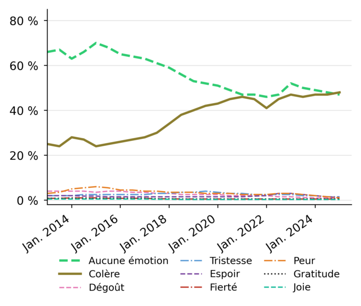 Économie de l’attention. La colère capte rapidement l’attention et favorise le partage. Nos résultats récents dans l’article Emotions and Policy Views (Algan et al. 2026) montrent que les messages colériques génèrent plus d’engagement que les messages neutres ou positifs, aussi bien chez les responsables politiques que chez les citoyens (voir section 3 pour les ordres de grandeur). Cette rentabilité alimente un apprentissage stratégique : les acteurs politiques ajustent leur communication, normalisant la colère comme registre ordinaire du débat (Strömberg 2015; Gennaro and Ash 2022; Zhang et al. 2025).