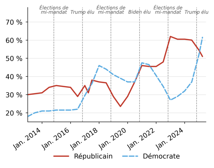 La Figure 3 (panneau de droite) révèle une dynamique parallèle aux États-Unis : une hausse sans précédent de la rhétorique de la colère parmi les députés républicains depuis la présidence Biden, rejointe par celle des démocrates depuis l’élection de Trump en 2024. La convergence est frappante : les deux camps se retrouvent désormais sur un même plateau d’intensité émotionnelle.
