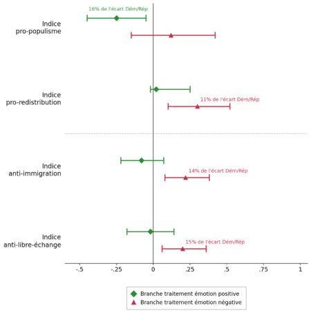 Des expérimentations contrôlées récentes (Algan et al. 2026) exposent aléatoirement des répondants à des stimuli émotionnels sans aucun contenu politique explicite puis mesurent leurs préférences concernant différents domaines de politiques publiques. Ce design expérimental permet d’isoler l’effet causal des émotions, de neutraliser les biais idéologiques, et de comparer les effets différenciés de la colère, de la peur et des émotions positives.