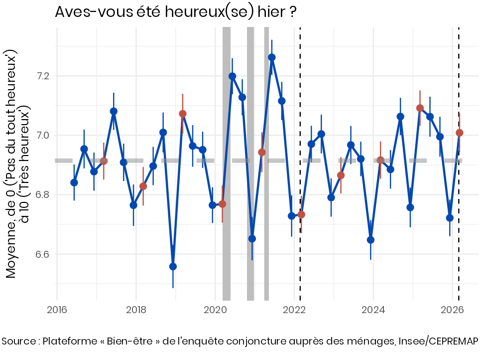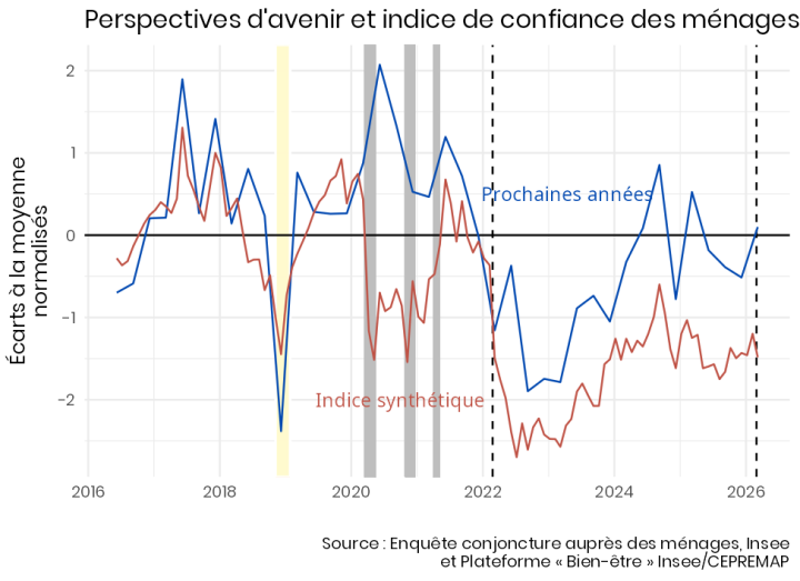 Malgré la guerre, l’appréciation de l’avenir individuel — ce que vous allez vivre dans les prochaines années — remonte un peu, jusqu’à sa moyenne depuis 2026 (Figure 6). Parallèlement, l’indice synthétique de confiance des ménages de l’Insee, largement fondé sur les anticipations économiques des ménages, baisse légèrement.