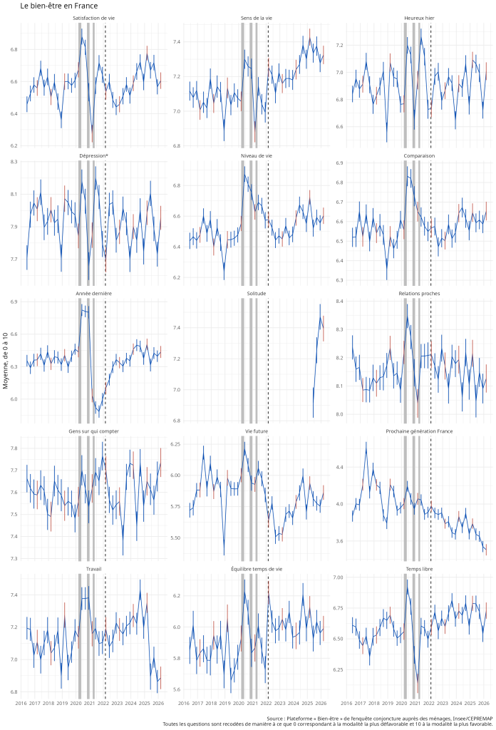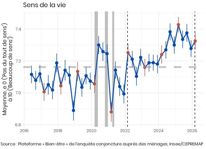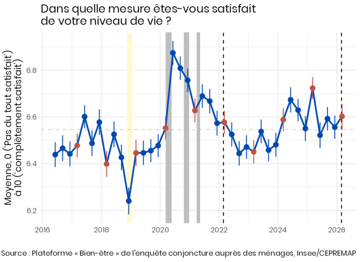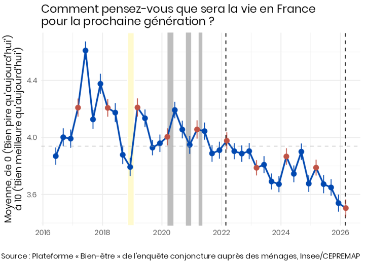 Le bien-être des Français en mars 2026 ne semble pas avoir été affecté par le début de la guerre en Iran ni par ses conséquences sur le prix des carburants. Les grands indicateurs sont stables ou reviennent à leur niveau habituel pour le printemps. La perception des perspectives de la prochaine génération demeure sombre.