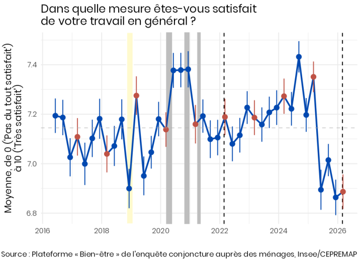La satisfaction au travail a décroché en juin 2025 et reste à un niveau bas depuis, en-dessous du niveau de décembre 2018, à la veille de la crise des Gilets Jaunes (Figure 5).
