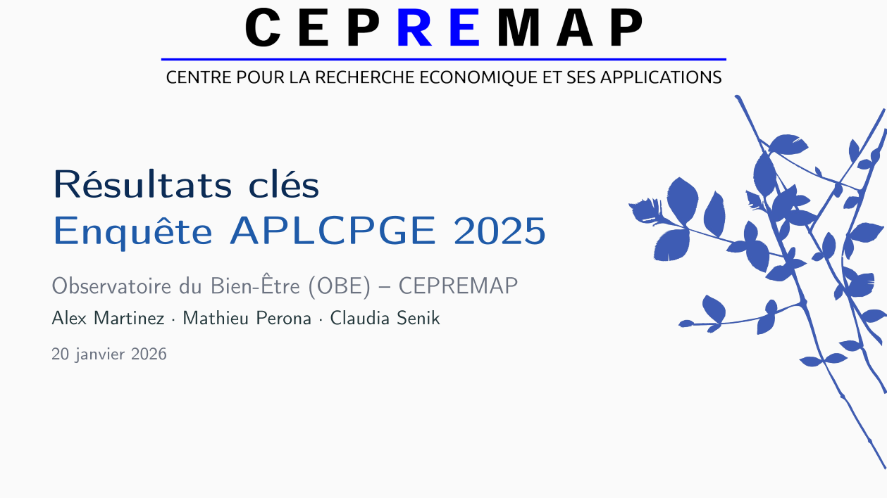 Nous avons eu le plaisir de présenter à l’APLCPGE notre analyse de la vague 2025 de leur enquête sur les perceptions et le bien-être des élèves de CPGE. Vous pouvez découvrir notre présentation (cliquez sur l’image pour la présentation complète).
